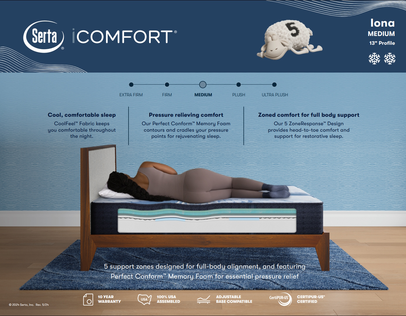 The Serta iComfort Iona Medium features 5 support zones designed for full-body alignment, and featuring Perfect Conform Memory Foam for essential pressure relief.